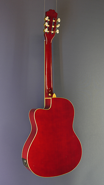 Beaver Creek, red finished classical guitar with pickup, solid spruce top, cutaway and pickup, back view