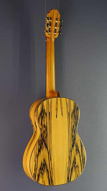 Ricardo Moreno, model C-E, classical Spanish guitar with solid cedar or spruce top and white ebony on back and sides, back view