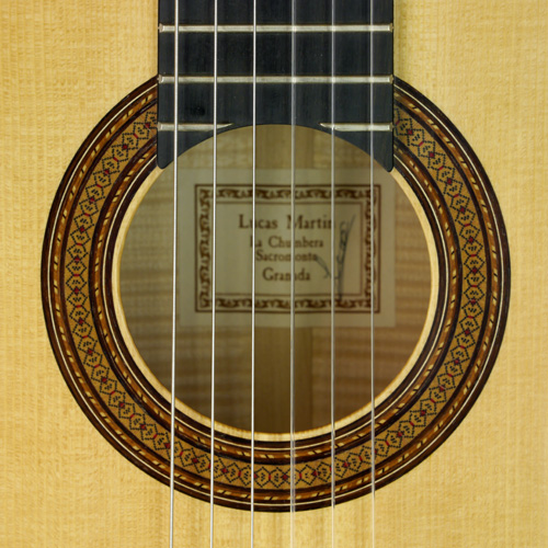 Rosette and label of the classical guitar built by Spanish guitar maker Lucas Martin in 2016 with spruce top and rosewood back and sides