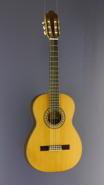 Classical guitar with solid spruce- or cedar top and rosewood on back and sides (in early years with a double rosewood back), scale 65 cm (photo with cedar top)