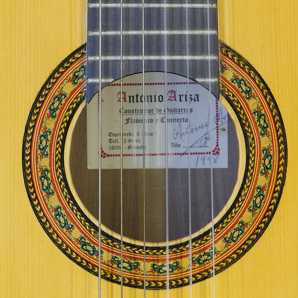 Classical guitar built by Spanish luthier Antonio Ariza in 1998 with spruce top and walnut back and sides, rosette, label