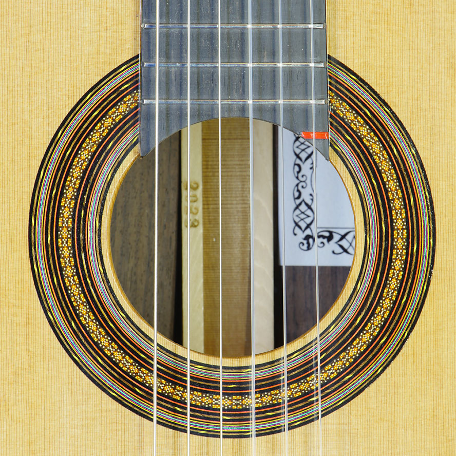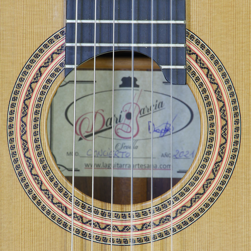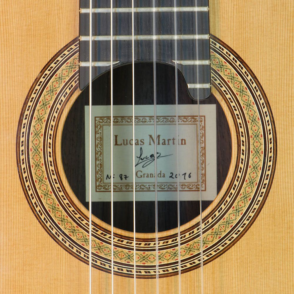Rosette and label of the classical guitar built by Spanish guitar maker Lucas Martin in 2016 with cedar top and rosewood back and sides