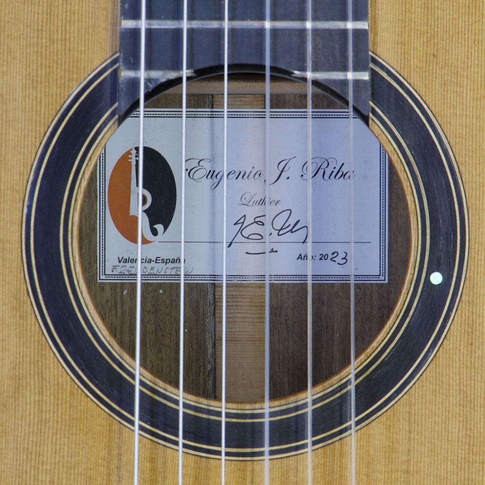 Spanish guitar built in 2023 by guitar maker Eugenio Riba with cedar top and mongoy back and sides, short scale 64 cm, Rosette and label