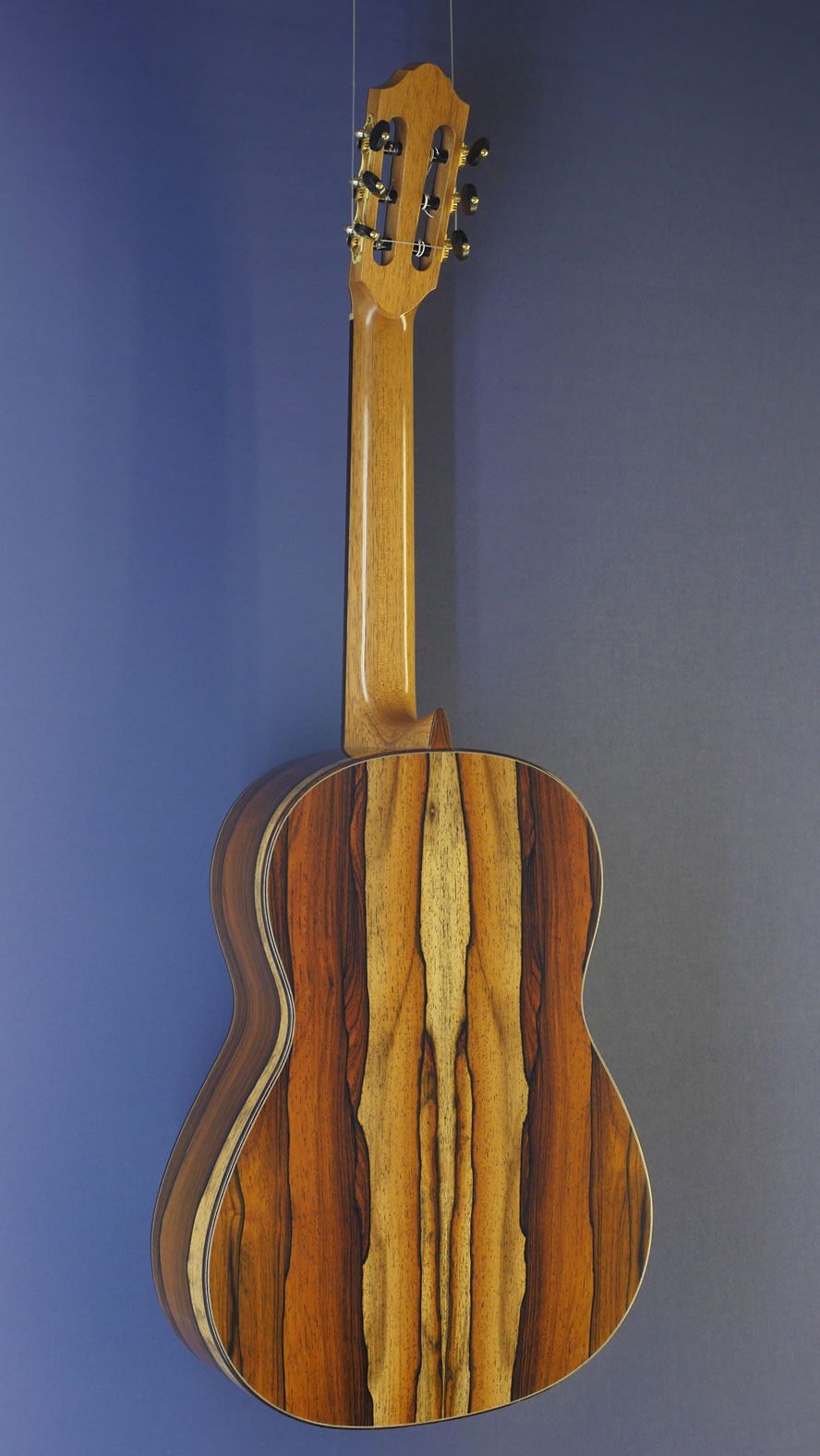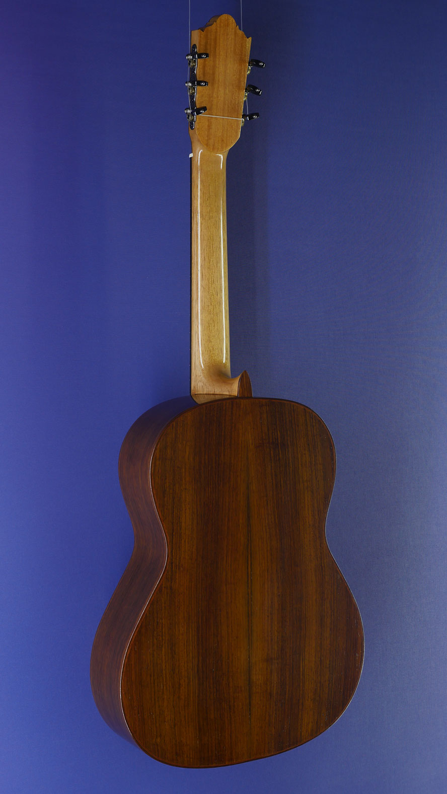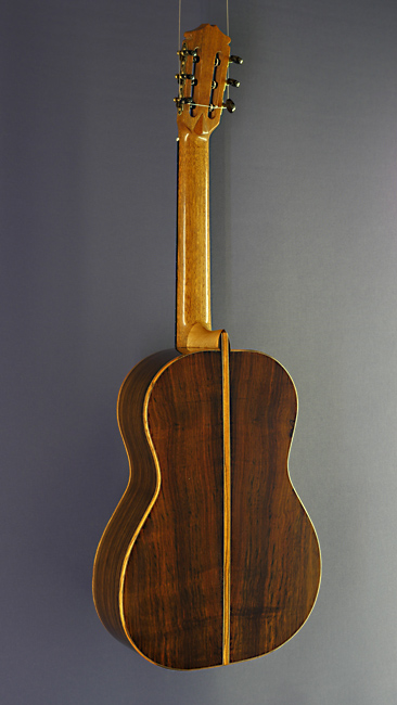 Hein Gitarrenbau - Reiner Hein, luthier guitar built with shape after Santos Hernandez (1924) and double soundhole after Francisco Simplicio (1930) with double soundhole, cedar top and back and sides made of zebrano, scale 65 cm, year 2020, back view