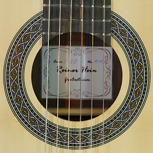 Classical guitar built by Reiner Hein with spruce top and rosewood back and sides, scale 65 cm, year 2020, rosette, label