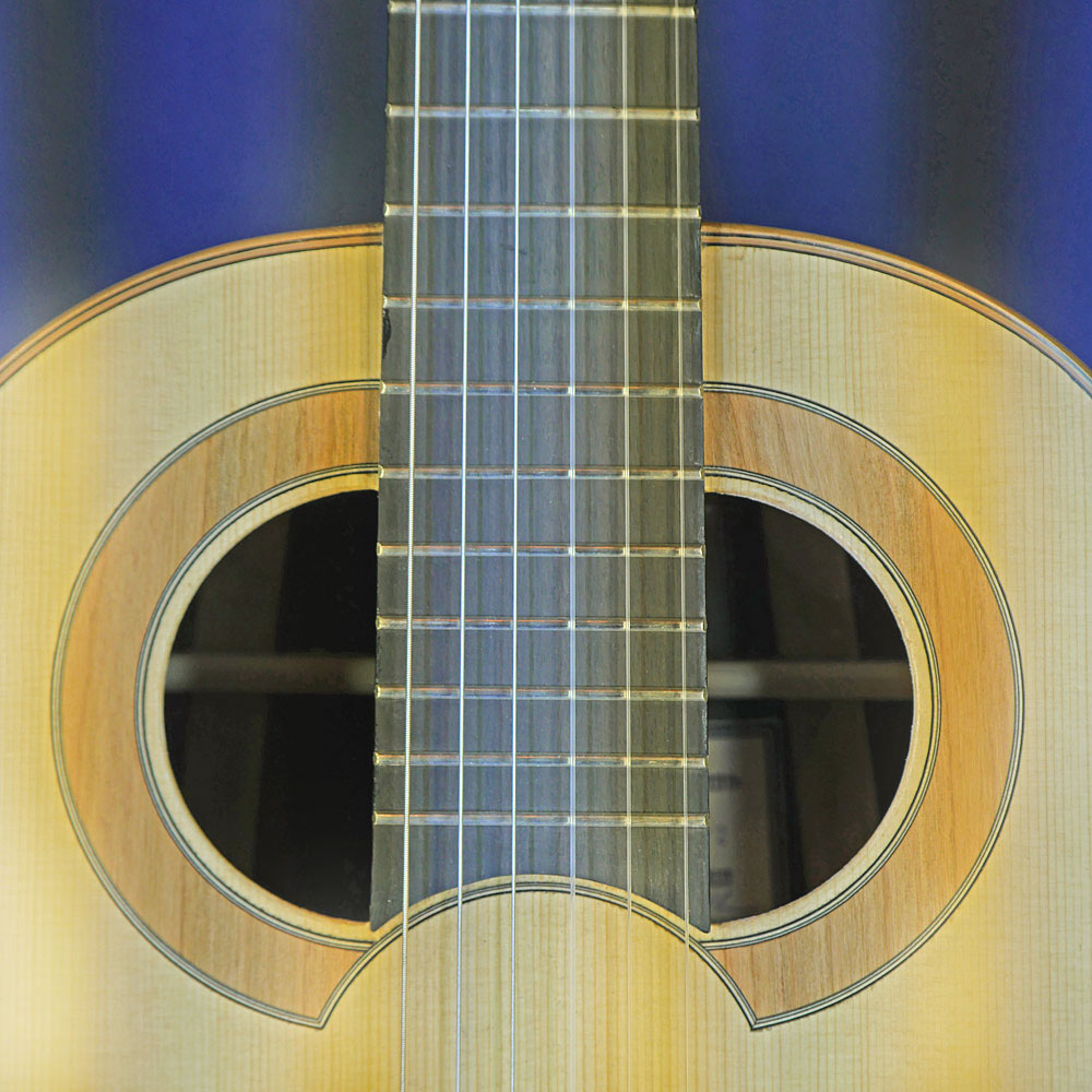Hein Gitarrenbau, fine handmade guitar built by Reiner Hein in 2020, shape after Santos Hernandez (1924) and double soundhole after Francisco Simplicio (1930), cedar, zebrano, scale 65 cm