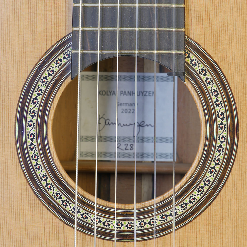 Kolya Panhuyzen Luthier guitar with cedar top (lattice bracing) and rosewood back and sides, scale 65 cm, year 2022, rosette and label