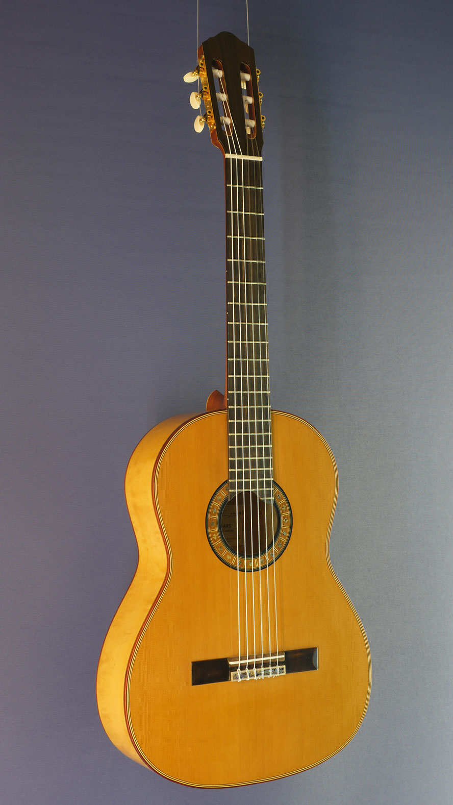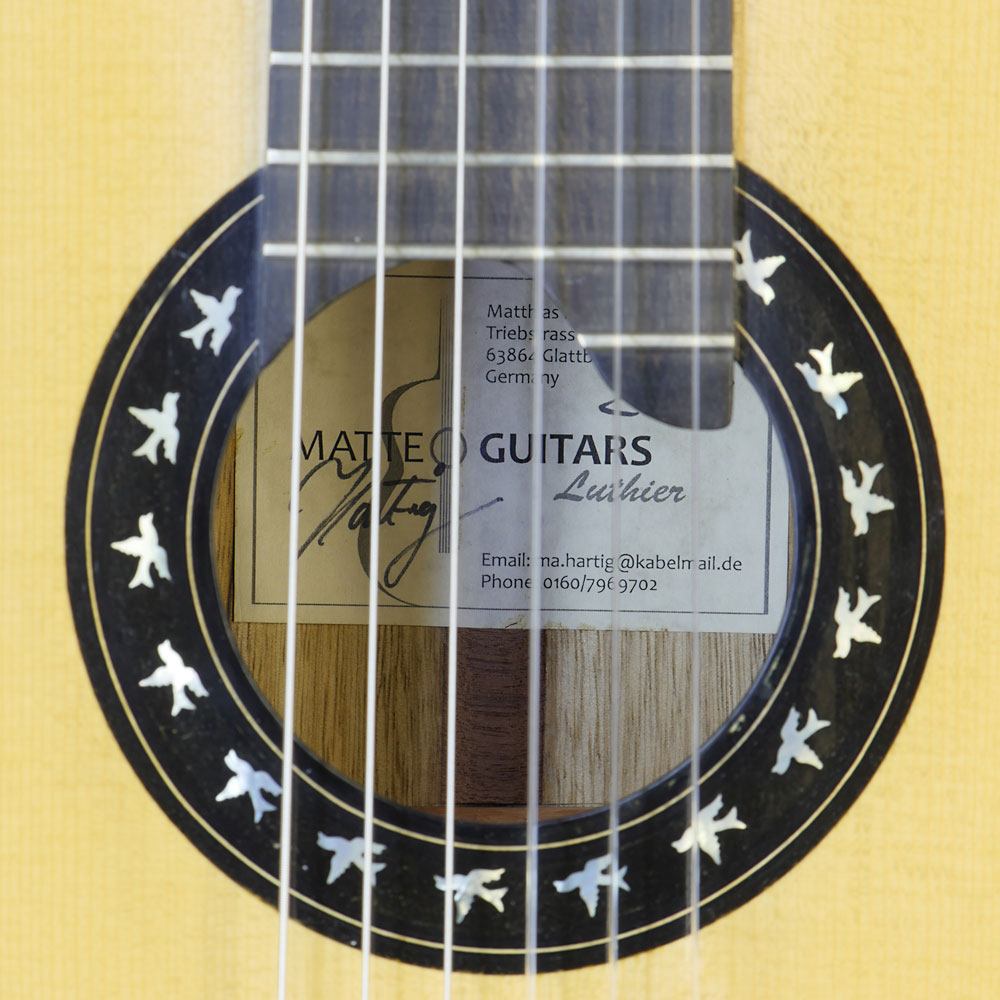 Classical guitar built by German guitar maker Matthias Hartig with cedar top and back and sides made of maple, scale 65 cm, year 2019, rosette, label