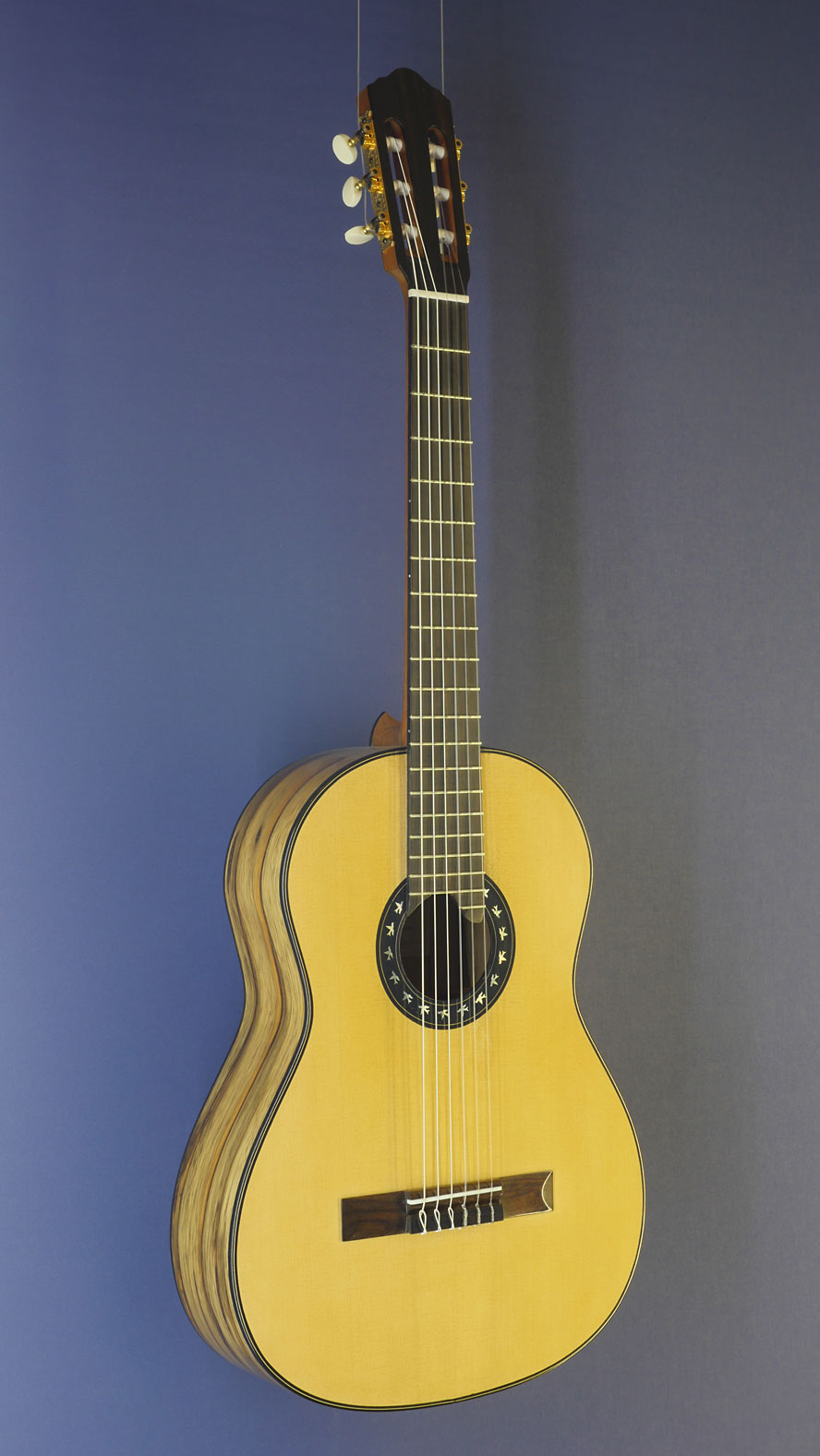 Classical guitar built by Reiner Hein, shape after Santos Hernandez (1924) and double soundhole after Francisco Simplicio (1930) with cedar top and zebrano back and sides, scale 65 cm, year 2020, rosette, label