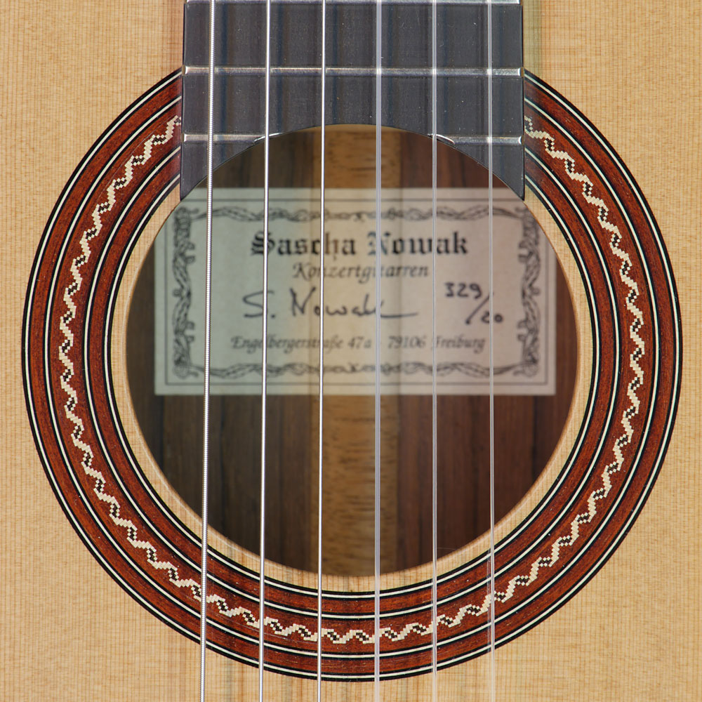 Classical guitar built by German guitar maker Sascha Nowak with double top cedar and back and sides made of Madagascar rosewood, year 2020, rosette and label