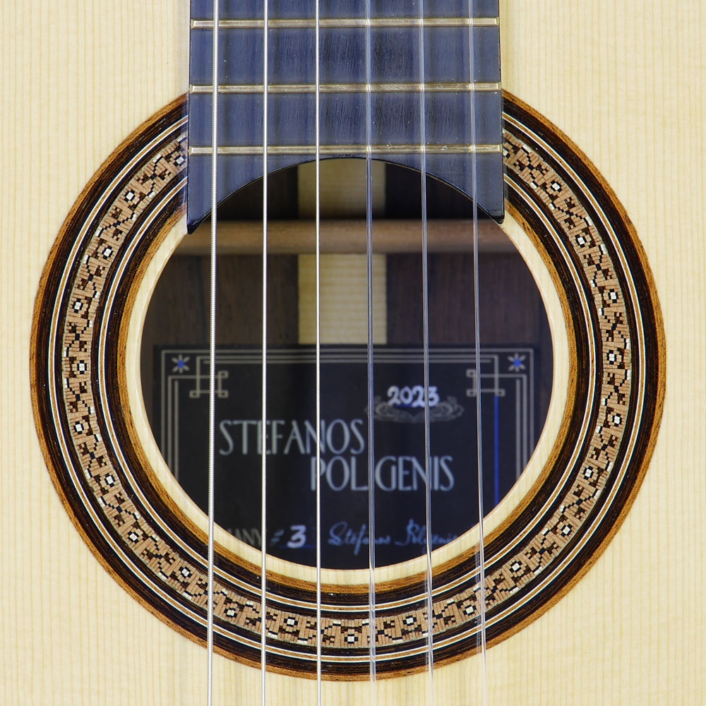 Classical guitar built by guitar maker Stefanos Poligenis with spruce top (double top latice bracing) and Madagascar rosewood back and sides, year 2023, rosette and label