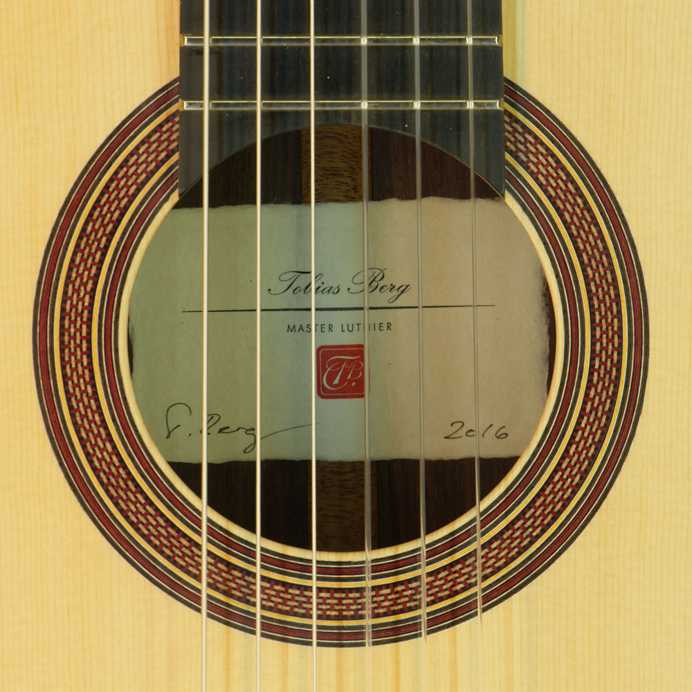 Classical guitar built in 2016 by guitar maker Tobias Berg with spruce top and rosewood back and sides, rosette and label
