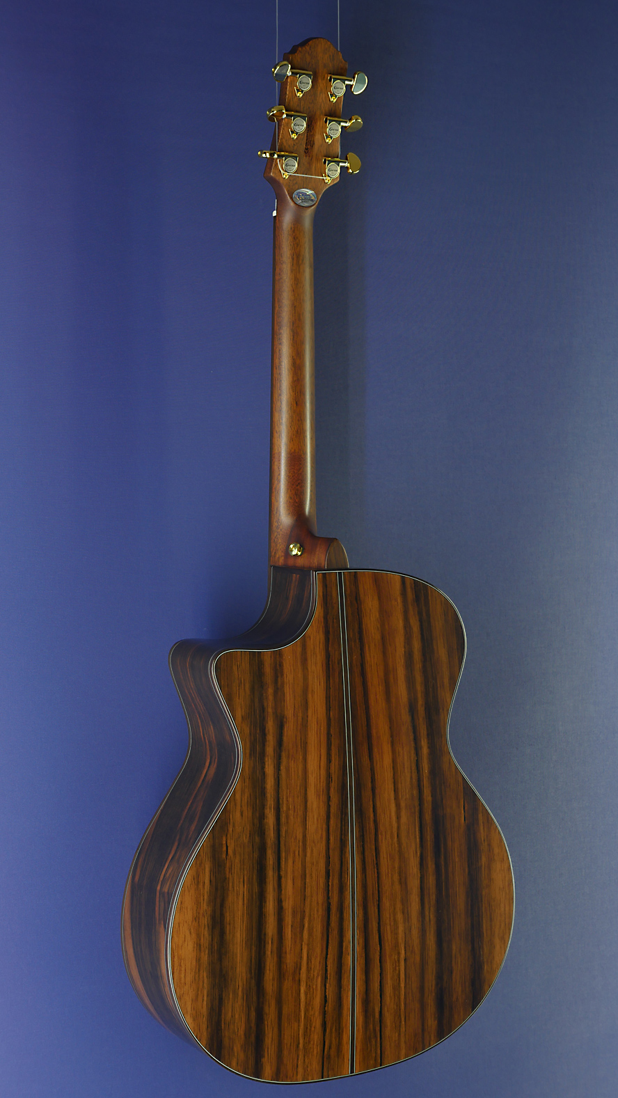 Taiki, steel-string guitar Grand Concert form with roundback, cutaway and pickup, back view