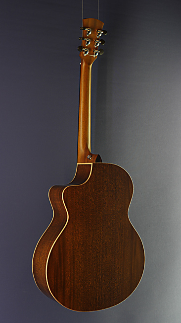 Tanglewood Winterleaf, antique violin burst acoustic guitar with pickup in Folk shape with solid mahogany top and mahogany on back and sides, with cutaway, back view